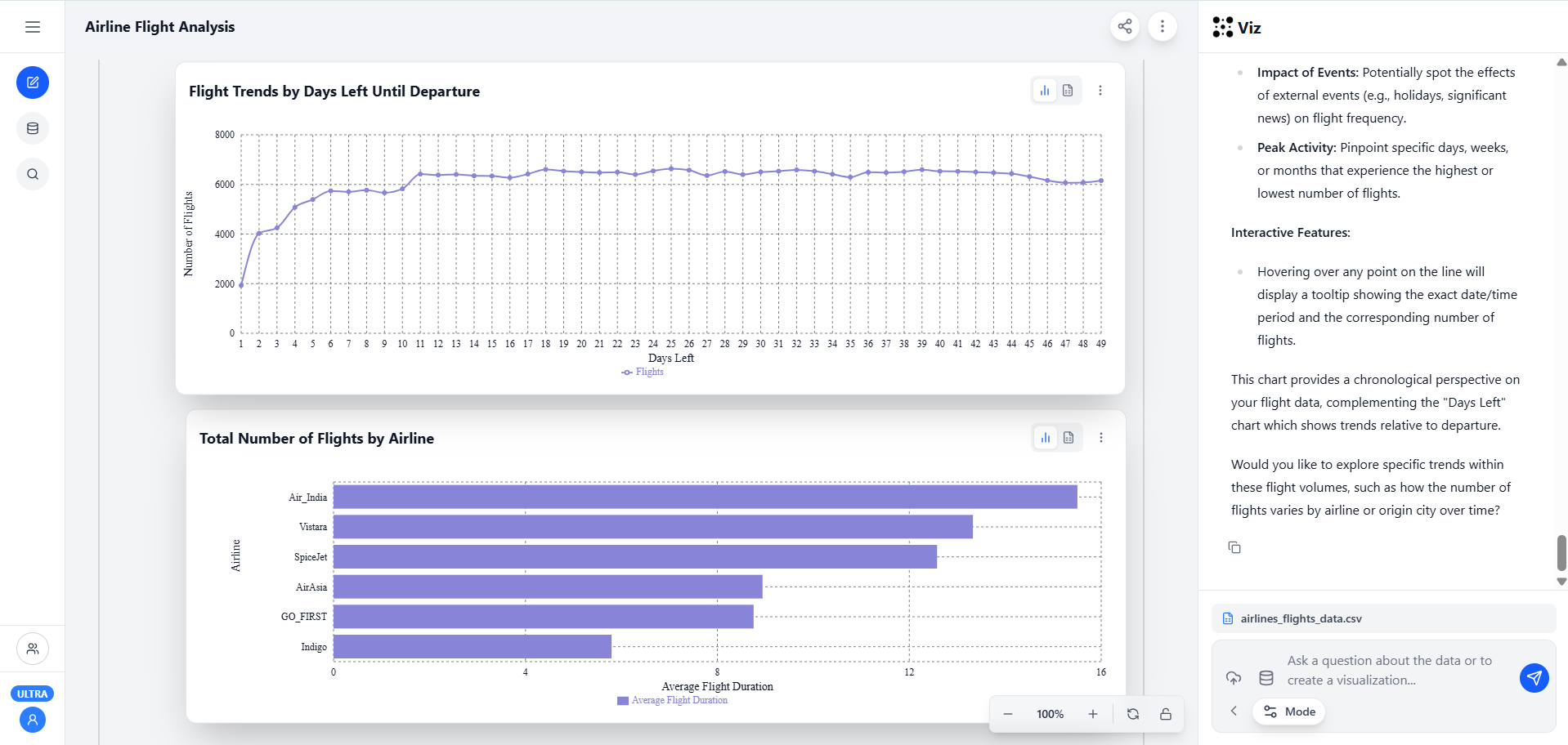 Viz transforms your data into interactive dashboards with multiple visualizations. Users can explore patterns, compare metrics, and understand results through clear charts and contextual explanations.